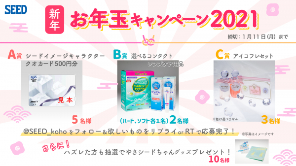 コンタクトレンズの製造販売を行う株式会社シード(本社:東京都文京区、代表取締役社長:浦壁 昌広、東証1部:7743)は、2021年1月4日(月)~1月11日(月)の間、シード公式Twitterにおいてシード商品やオリジナルグッズ等が総勢20名に当たる『シード お年玉キャンペーン2021』を開催いたします。