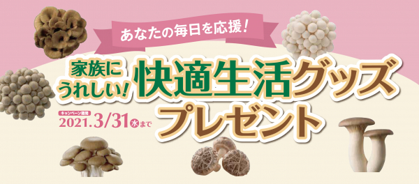 きのこ総合企業のホクト株式会社(所在地:長野県長野市、代表取締役社長 水野雅義)では、“きのこで菌活”を実践いただくことで体を健康に保ち、コロナ禍の中、おウチ時間がより充実するようなアイテムで、家族で楽しく過ごしていただこうと「家族にうれしい!快適生活グッズプレゼント」キャンペーンを開催しています。期間は2021年1月1日から3月31日までです。