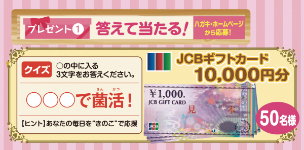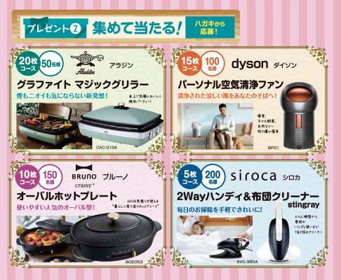 クイズに答えて当たるコースでは、JCBギフトカード10,000円分が50名様に。また、ホクトのきのこのパッケージに付いているHOKTOマークを必要枚数分集めて応募するコースでは、「Aladdin グラファイトマジックグリラー」、「dyson パーソナル空気清浄ファン」、「BRUNO オーバルホットプレート」、「siroca 2wayハンディ&布団クリーナーstingray」の4種類が合計500名様に当たります。