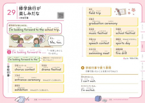 〇〇が楽しみ、わくわくしている、など役立つ表現もいっぱいで、「遠足」「運動会」「学芸会」などの単語もカンタンに探せます。