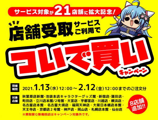 対象店舗:池袋本店キャラクターグッズ館、秋葉原店新館、新宿店、蒲田店、名古屋店本館、名古屋大須店、天王寺店、立川店本館、立川店2号館、大宮店、川越店、横浜店、福岡天神店、町田店、大阪日本橋店本館、宇都宮店、仙台店、神戸店、京都店2号館、岡山店、札幌店本館