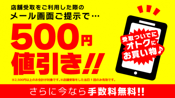 【500円値引きクーポン】は通販注文後の店舗到着お知らせメールについているので、商品をお店で受け取る際の「お買い物」でご利用いただけけます。