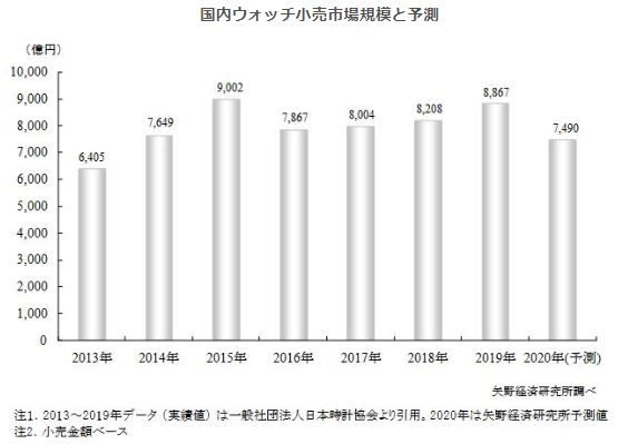 一般社団法人日本時計協会データによると2019年の国内ウォッチ市場規模は小売金額ベースで、前年比108.0%の8,867億円であった。