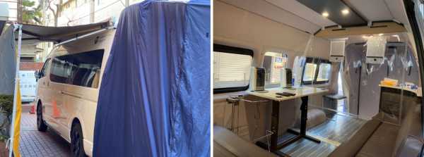 今回導入した車両はJapanCRCのオリジナルキャンピングカー「ロビンソンV95」で、車内で100V電源が使用できる他、エンジンを停止した状態でも使用できる暖房機「FFヒーター」が標準で搭載されているなど、車両単体で医療施設としての代用が可能となります。導入から運用まで時間を要さず、病院側の事情や天候に応じて素早く移動できる利点もあるため、受け入れ先の検査体制や車両の配置ロケーションに応じた運用が可能です。