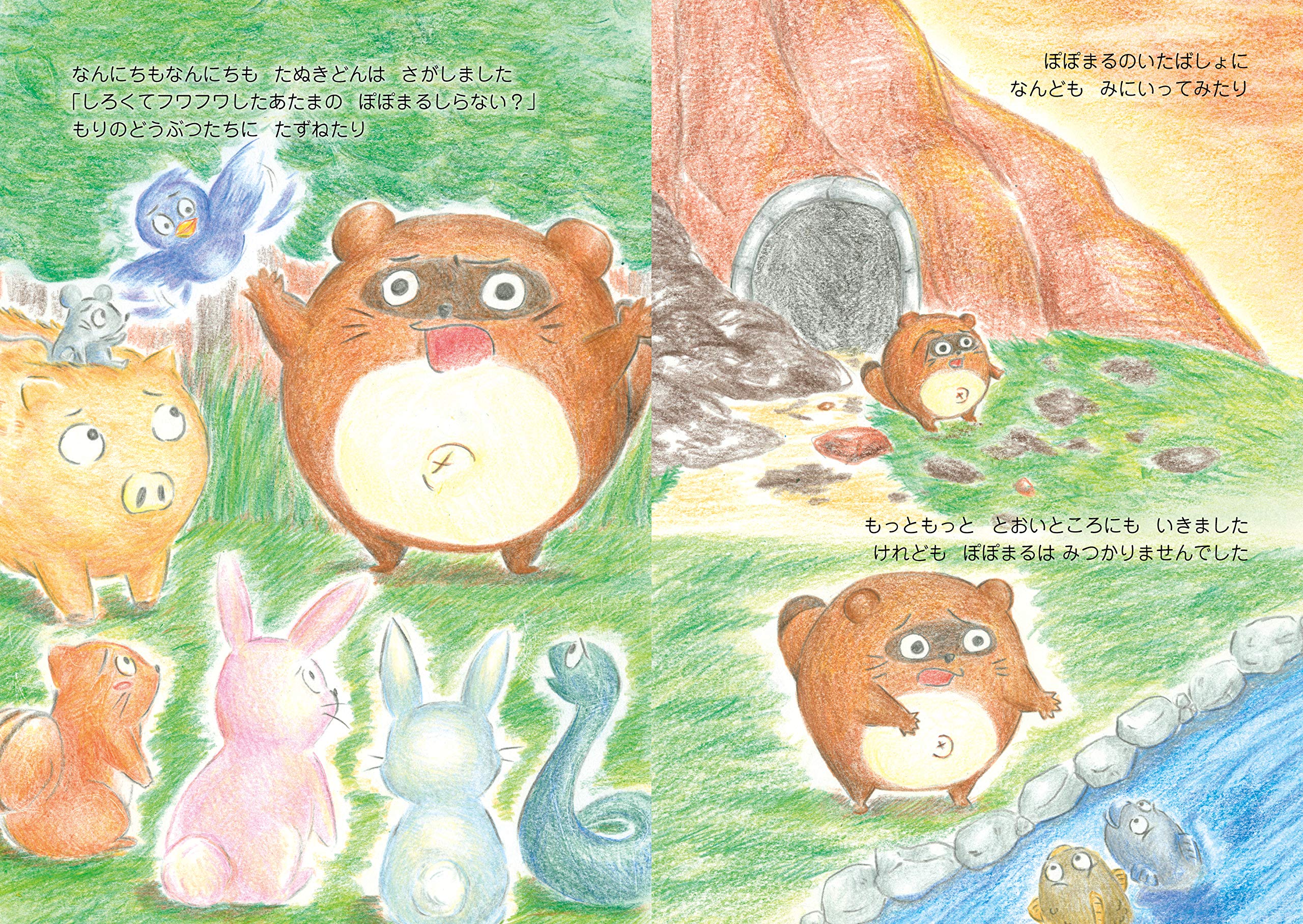 寂しい気持ちに押し潰されそうになりながら、たぬきどんは必死にぽぽまるを探し続けます。