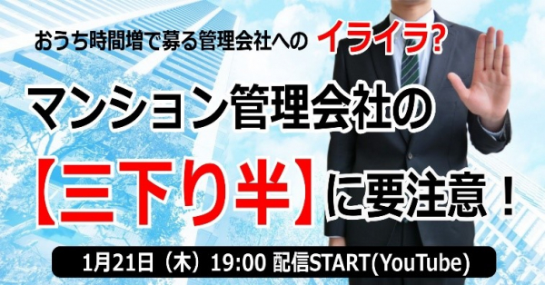 そこで、業界初の個人向け総合不動産コンサルティング・ホームインスペクション(住宅診断)、マンション管理組合向けコンサルティングを行う "不動産の達人 株式会社さくら事務所"(東京都渋谷区/社長:大西倫加)では、1月21日(木)にマンション管理組合向けに「マンション管理会社の"三下り半"に要注意」と題したオンラインセミナーを開催いたします。今現在、管理会社変更をお考えの方には後々後悔しないためのリプレイス危険度チェックや更にマンション管理業界の現状、管理組合に必要とされる対応策をさくら事務所マンション管理コンサルタントが解説します。