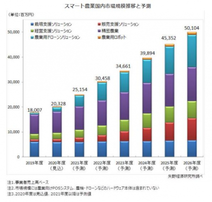 スマート農業の国内市場規模は2026年度には501億円まで拡大すると予測する。