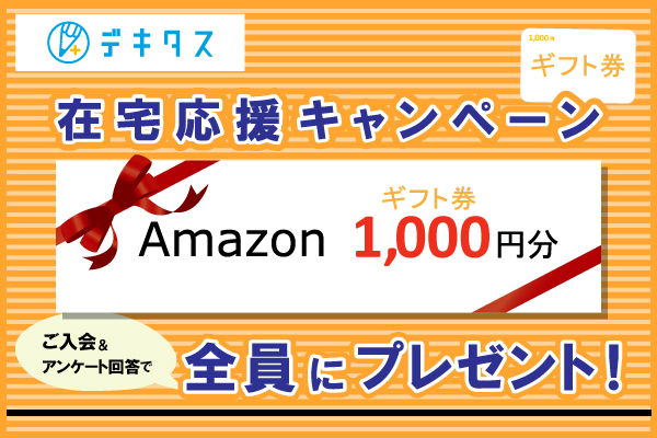 2021年1月中にデキタスに新規入会し、2021年2月28日(日)までに「デキタス新規ご入会に関するアンケート」にご回答いただいた方全員に、Amazonギフト券1,000円分を謝礼としてお送りいたします。