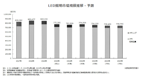 LED照明市場はかつてのような伸びはみられず、年々市場成長率は鈍化している。2019年にはマイナス成長となり、2020年は東京オリンピック・パラリンピック開催に伴うインフラ整備需要減少のほか、コロナ禍を背景とした経済環境の悪化も重なり、大きく減少する見込みである。但し、コロナ禍の収束時期が見通せず、先行き不透明ではあるが、フロー(年間出荷)ベースでのLED化率(SSL[半導体照明]器具化率)は既に100%近くあり、フロー市場における数量面での大幅な伸びはもはや期待できない。また、LED照明のコモディティー化による価格競争の激化により、金額ベースでのLED照明市場の伸びはさらに難しい状況である。