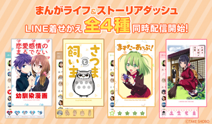 株式会社竹書房×株式会社インクルーズが贈るLINE着せかえシリーズ第4弾は、「まんがライフ」と「ストーリアダッシュ」より「恋愛感情のまるでない幼馴染漫画」、「さつまと飼い主」、「ますたーあっぷ!」、「ト或ル夫婦ノ日乗」がLINE着せかえとなって一斉に新登場です。今後も竹書房とインクルーズのコラボレーションにより、続々とLINE着せかえの配信を予定しておりますので、是非お気に入りのLINE着せかえを見つけてみてください。