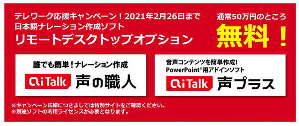また、本日より「テレワーク応援キャンペーン」を開催し、オプションの無料提供及び、各種ナレーション作成ソフトを特別価格でご提供いたします。