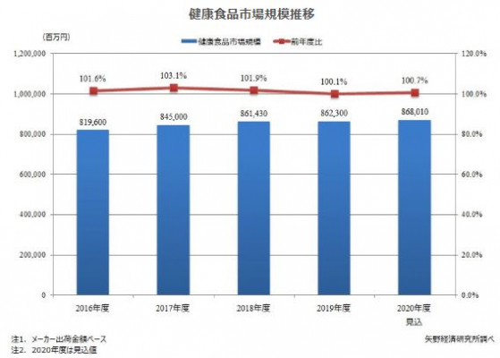 2019年度の健康食品市場規模はメーカー出荷金額ベースで、8,623億円(前年度比0.1%増)、2020年度は8,680億1,000万円(同0.7%増)を見込む。