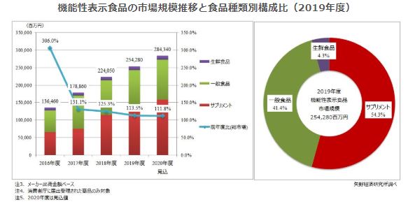 一方、サプリメントに関しては、機能性表示内容を前面に押し出した広告宣伝を積極的に実施し、売上を伸ばす主軸商品に加え、商品の品揃えの一つとして、既存顧客向けに展開を行う商品も多い。それらの商品は個々の売上高は僅少でありながらも、新発売または販売中の品数が多く、結果として市場規模の大幅な拡大に繋がっている。また機能表示(保健用途)の広がりも、市場規模の拡大に寄与している。