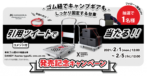 空港・産業用・キャンプ・個人向け台車など物流機器を製造・販売する花岡車輌株式会社(本社:東京都江東区、代表取締役社長:花岡 徹)の台車DANDYシリーズのフラッグシップモデル「DANDY Xシリーズ」の新型小型台車「type XL」(https://www.hanaoka-corp.co.jp/typexllineup)は、小型配送業・オフィス・キャンプといった小物配送シーン向け商品を2021年1月25日から発売開始致しました。発売を記念して、抽選で1名様に台車が当たる「コメント付き引用ツイートで当たる!DANDY X series type XL発売記念キャンペーン」を開催いたします。
