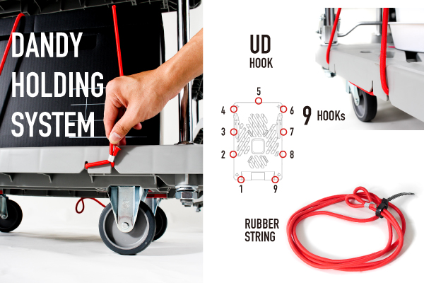 台車本体側部にゴム紐を固定できる切り欠き「UDフック」を前後左右に9箇所標準装備し、専用ゴム紐(別売)で好きなように固定していくことが可能です。もう一人、荷台の荷物を抑える人がいないと運べない、、、なんてシーンにぴったりの機能です。