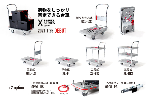 2019グッドデザイン賞を受賞した「DANDY Xシリーズ」の新ラインナップとして小サイズ(150kg)「type XL」が加わります。受賞した大サイズ(300kg)「type XA」の製品特徴である「静音性・軽量化・本体の運搬性」の遺伝子をしっかり引き継ぎながら、小型台車が活躍するシーンでお客様が困る「荷崩れ」を根本解決する機能をさらに追加いたしました。シーンとしてショップや作業現場や小型配送や展示会の搬入出、マンションでの使用といった「人や物が多い狭い場所で、台車を左右に避けながらも、たくさんの荷物をなんとか一度でしっかり運びたい」という要望に応えるべく開発を進めてまいりました。