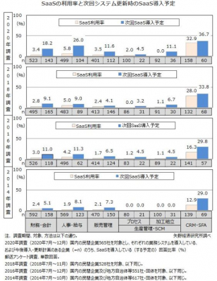 株式会社矢野経済研究所(代表取締役社長:水越孝)は、国内の民間企業を対象として郵送アンケート調査を実施し、ERP及びCRM・SFAといった業務ソフトウェアの利用状況を明らかにし、SaaSの利用率について分析いたしました。