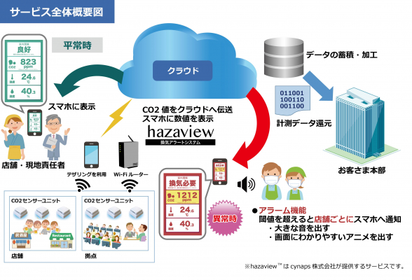 「CO2計測による3密回避支援サービス」は、cynaps(シナプス)株式会社のCO2等計測IoTシステム「hazaview TM」と連携し、店舗や各種施設に設置した高精度CO2センサーが計測したデータをクラウドに送り一括管理を行います。店舗や施設責任者のスマートフォンにCO2計測値を常時表示するとともに、万一基準値を超えるCO2が計測された場合はスマートフォンの画面やスピーカー音で即時に異常を知らせます。見落とされがちなメールによる通知と異なり、リアルタイムで警告を把握し、迅速な対応を取ることができます。
