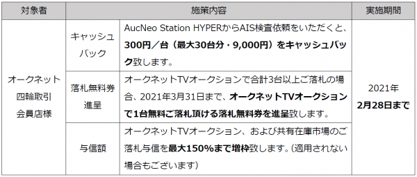 そして1月8日に再度発令された緊急事態宣言を受けて、オークネットは全国の中古車事業者の皆様のリモートワーク支援をより一層推進すべく、会員店様向けに「情報流通サポートキャンペーン」を1月18日から2月28日まで実施致します。具体的には、WEBを通じたAIS検査依頼におけるキャッシュバックや、オークネットTVオークションでのご落札台数に応じた落札無料券の進呈、そしてご落札与信増枠となります。