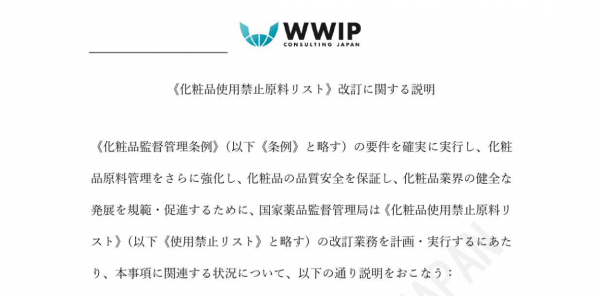 株式会社ワールドワイド・アイピー・コンサルティングジャパン(以下「WWIP」という)では、中国食品検定研究院は、2021年1月22日、新化粧品条例(昨年6月29日公布、本年1月1日より施行)における、「化粧品使用禁止原料リスト」の改訂版(意見募集稿)を公表したことに伴い、当改定の趣旨説明の日本語翻訳並びに、禁止原料リスト(意見募集稿)*1を1月28日より無償でご提供いたします。