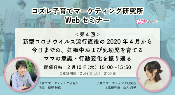 株式会社コズレの社内シンクタンク「コズレ子育てマーケティング研究所」は、2021年2月10日(水)に、子育て世代向けマーケティングWebセミナー「新型コロナウイルス流行直後の2020年4月から今日までの、妊娠中および乳幼児を育てるママの意識・行動変化を振り返る」を開催することを本日、お知らせいたします。