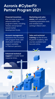 サイバープロテクションのグローバルリーダーであるアクロニスは本日、新しいAcronis #CyberFit パートナープログラムの詳細を発表しました。アクロニスの既存のプログラムに対する今回の更新では、特にクラウドベースのサービスについて、パートナーの発展のための支援をさらに重視すると同時に、サービスプロバイダーとリセラーに対して、専門知識、専念度、アクロニスとの成長に応じて、パフォーマンスベースの特典や金銭的報酬を通じて報奨します。