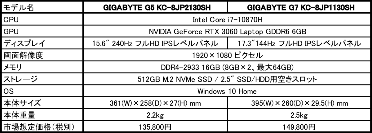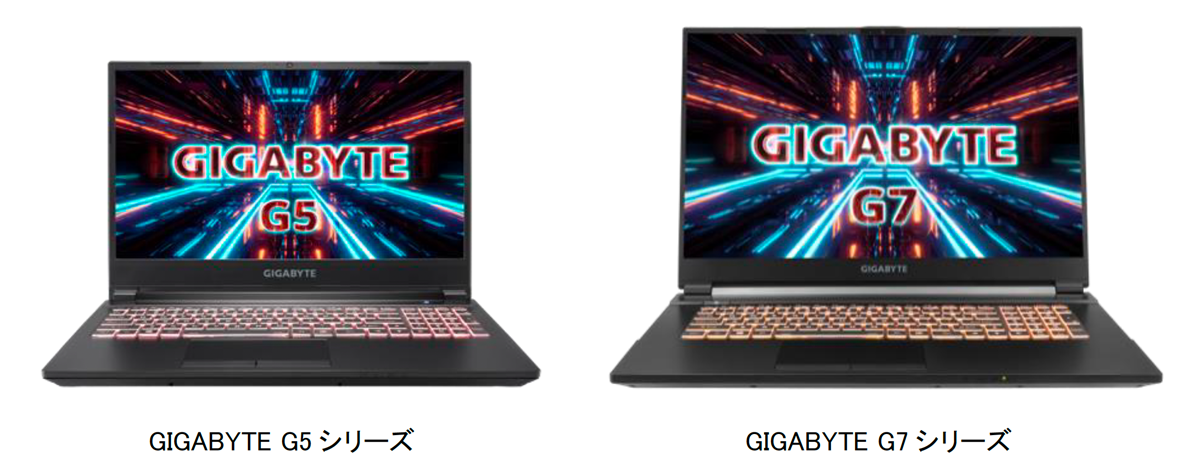 GIGABYTE Gシリーズは、15.6型フルHDパネルを採用した「GIGABYTE G5 KC-8JP2130SH」と、17.3型フルHDパネルを採用した「GIGABYTE G7 KC-8JP1130SH」の2製品をラインナップし、CPUにはIntel Core i7-10870H、GPUにはNVIDIA GeForce RTX 3060モバイル版を搭載。GIGABYTE G5 KC-8JP2130SHは240Hzの高リフレッシュレート駆動に対応した狹額縁15.6型フルHD IPSレベルパネルを、GIGABYTE G7 KC-8JP1130SHは144Hz駆動の17.3型フルHD IPSレベルパネルを組み合わせ、快適なゲームプレイを実現します。