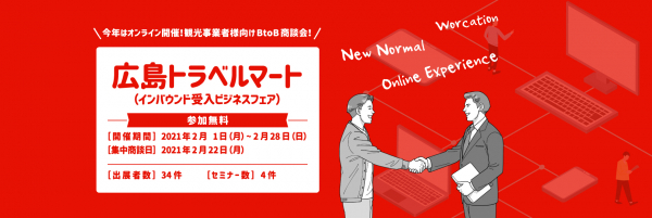 ピープルソフトウェア株式会社は、2021年2月1日(月)から28日(日)までオンラインで開催される「広島トラベルマート(インバウンド受入ビジネスフェア)」に出展しています。スマートフォンアプリを使った、文化や観光の分野に対しての事例をご紹介します。