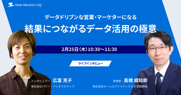 株式会社パワー・インタラクティブは、全社的にBIツールを導入したが活かし方がわからない方を対象に、株式会社セールスアナリティクス代表の高橋威知郎様をゲストにお迎えし、無料ウェビナー『結果につながるデータ活用の極意』(参加無料)を、2月25日に開催します。