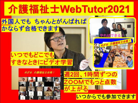 第33回介護福祉士国家試験筆記試験が去る1月31日に行われました。今回より外国人受験者はEPA介護福祉士候補者と同様に試験時間が通常の1.5倍になり、外国人合格者数の増加とともに、来年以降の外国人受験者数増加も期待されています。そこで、一般社団法人外国人介護職員支援センター(千葉県市川市、代表理事 井上文二)は、介護福祉士国家試験対策オンライン講座を外国人に限り、従来の半額である年間1万円で受講できるようにし、国家試験挑戦者を支援します。「WebTutor2021」というオンラインコースを2月1日にスタートしました。