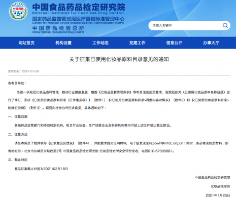 使用済み化粧品原料リストの意見募集に関する通知 発布日:2021-01-26