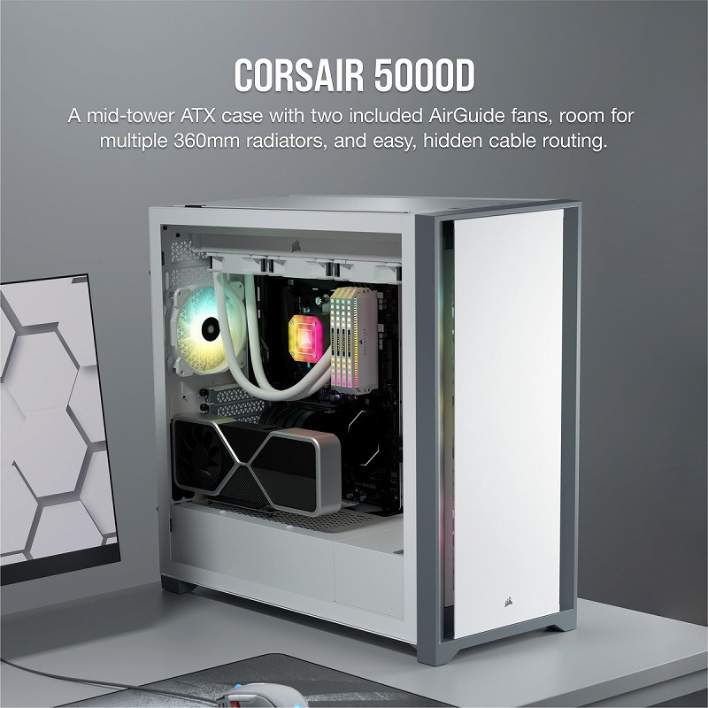 5000Dは、落ち着いたデザインのスチール製フロントパネル、サイドパネルに強化ガラスを採用したE-ATX対応PCケースです。右サイド、マザーボードトレイ部分に最大で120mmファン3基または360mmラジエータを搭載でき、見た目と冷却性を両立することが可能です。最大で10基の120mmファン、または360mmサイズの大型ラジエータを搭載することができます。最大420mmを確保した拡張カードスペースはグラフィックスカードの垂直マウントに対応、ブラックとホワイトの2カラーをラインアップ。※初期搭載の120mmファン2基はLED非搭載です。