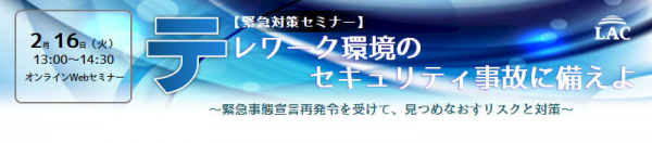 株式会社ラック(本社:東京都千代田区、代表取締役社長:西本 逸郎、以下ラック)は、2021年2月16日(火)に「【緊急対策セミナー】テレワーク環境のセキュリティ事故に備えよ」を開催します。