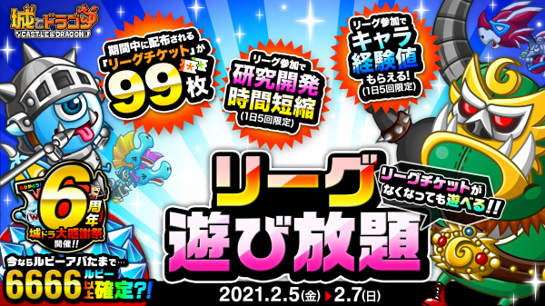 『城とドラゴン』6周年を記念し、全国のユーザーを相手にリアルタイムで戦うバトルイベント「リーグ」にて「リーグ遊び放題」キャンペーンを開催いたします。期間中は「リーグ」参加時に使用するチケットを1日99枚プレゼント!さらに、通常「リーグ」に追加で参加する際に必要な“ルビー”が、期間中は消費すること無く無制限でバトルをお楽しみいただけます。他にも、「リーグ」に参加するだけでキャラの育成効率がアップする(1日5回まで)など、とことん遊びつくせる内容となっていますので、この機会にぜひ「リーグ」にご参加ください!