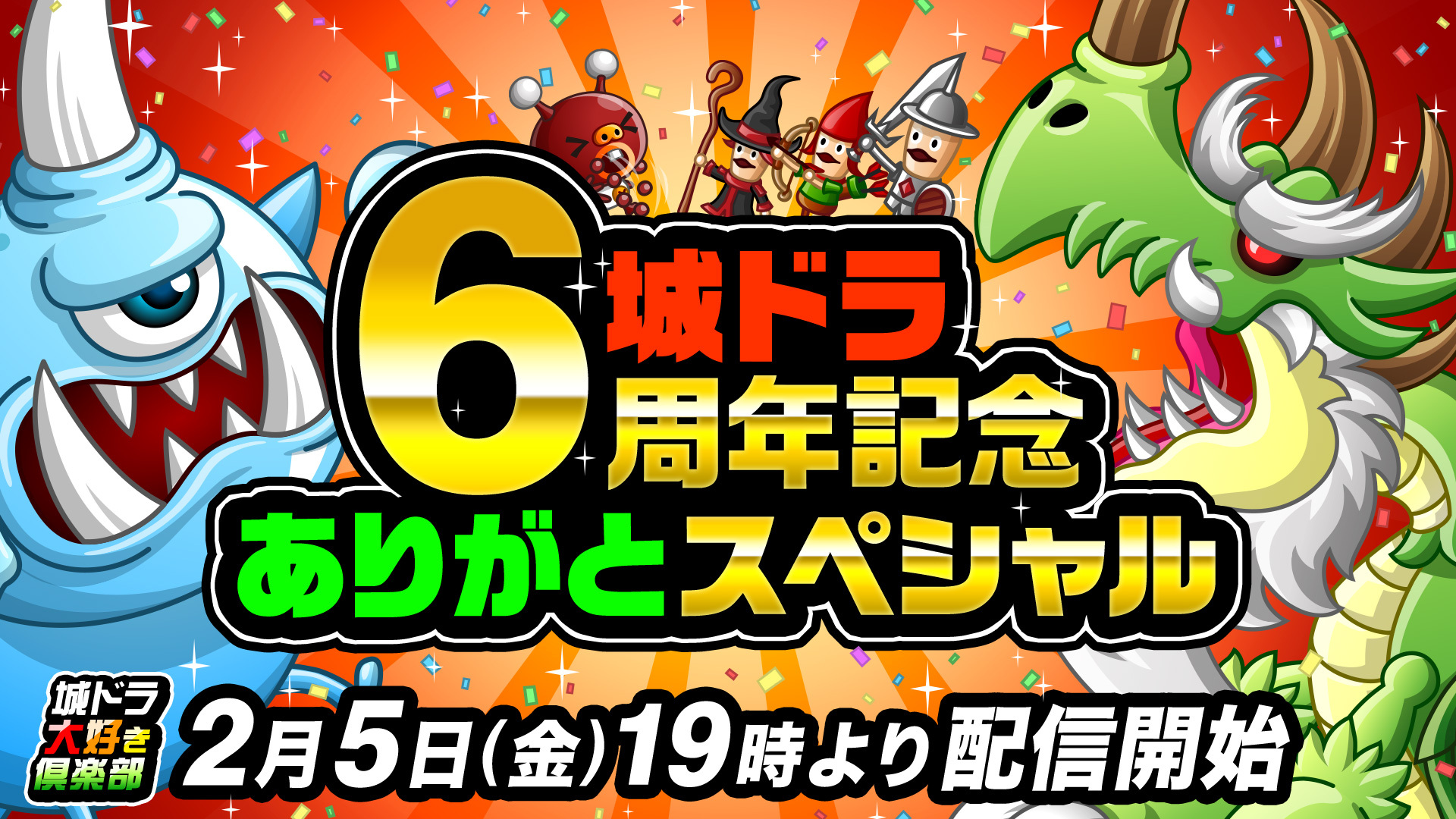 2021年2月5日(金)19:00~『城とドラゴン』公式YouTubeチャンネルにて「城ドラ6周年記念ありがとスペシャル」を配信!開発スタッフへのインタビュー企画では、普段聞くことのできない開発・運営の裏側やホンネがポロリ・・?!ぜひリアルタイムでご視聴ください!