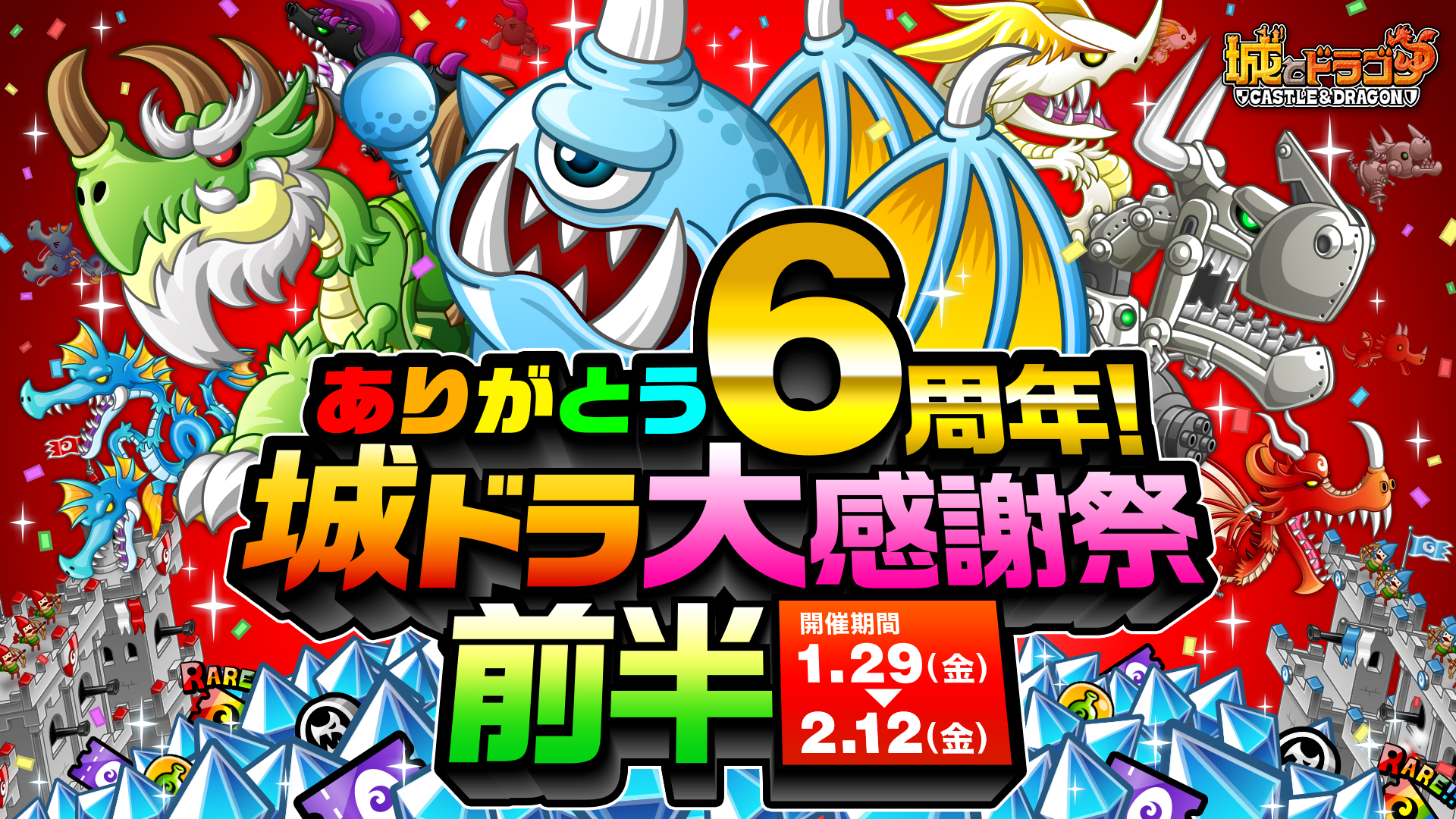 2021年2月5日(金)でサービス開始から6周年を迎える『城とドラゴン』。これを記念したキャンペーン「ありがとう6周年!城ドラ大感謝祭」(前半)が開催中です!特別なログインボーナスはもちろんのこと、必ず“6666ルビー”以上が当たる「ルビーアバたま」、新機能となる「6周年記念ミッション」やプレイヤーの中からテーマに沿って最優秀者が選出される「6周年城ドラMVP」、そして期間中は「リーグ」イベントに好きなだけ参加できる「リーグ遊び放題」など、さまざまなキャンペーンやイベントが目白押し!6周年もぜひ『城とドラゴン』でお楽しみください!