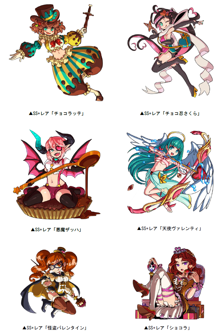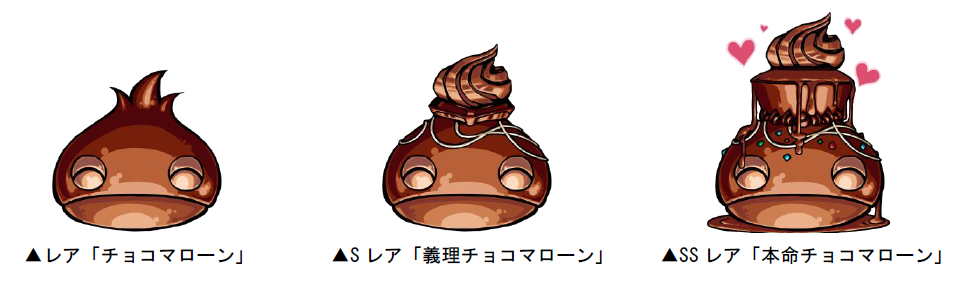「自分級」以上のボスモンスターとして、SSレア「チョコ騎士ヒルデ」「チョコ騎士ミューズ」「チョコ騎士リンス」が出現します。また、「真・本命級」ではSS+レア「チョコラッテ」「チョコ忍さくら」「悪魔ザッハ」「天使ヴァレンティ」「怪盗バレンタイン」「ショコラ」に加えて新登場の「メルティ・フェアリー」がボスモンスターとして出現することがあります。