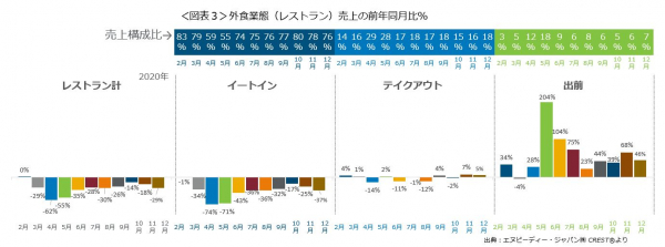 外食業態計(レストラン計)の売上前年同月比を利用形態ごとにみてみると(図表3)、出前の大幅増が続いており、4月は28%増、5月は204%増、6月は104%増、7月は75%増、8月は23%増、9月は44%増、10月は38%増、11月は68%増で、12月も46%増と2桁成長が続いています。外食業態のイートインは29%減で、11月より11ポイント後退し、第2波の7-8月と同程度のマイナス幅となりました。