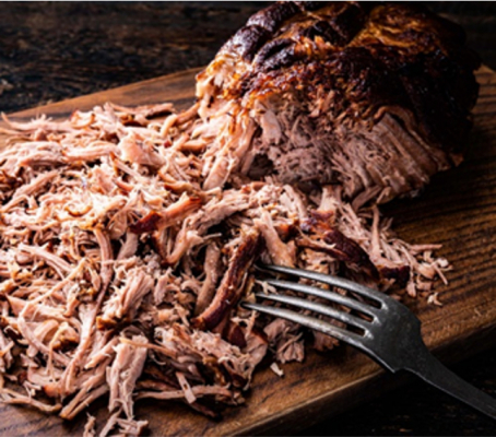 本場アメリカの味わいを意識し、じっくり火を通した豚の塊肉から、特殊製法により”手で裂いた様な”食べごたえのある食感にほぐした肉に、香り高いバーボンとフルーツの甘み・スパイスを効かせた、より複雑な味わいの特製BBQソースを合わせた冷凍調理済みのプルドポークです。