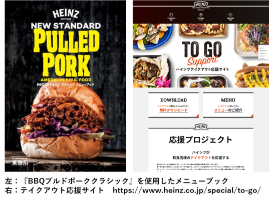 当社では新型コロナウイルスの感染拡大を受けて、昨年より業務用ホームページ(https://www.heinz.co.jp/)にて、テイクアウトメニューレシピやテイクアウトをワンランクアップさせるラベルやポスターを無料ダウンロードできるようにして、飲食店をサポートする取り組みをおこなっています。テイクアウトメニューではプルドポークを使用するレシピを複数紹介しており、さらに今回の新発売に合わせて新たに『BBQプルドポーククラシック』を使用したメニューブックを作成し、多彩なアレンジメニューを提案しています。