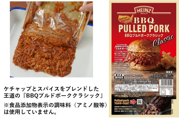 『BBQプルドポーククラシック』は、ハンバーガーやサンドイッチの具材として、また、ご飯にのせたりポテトのトッピングなどにも合わせやすく、完成までに半日ほど手間暇かかるBBQメニューを解凍するだけで簡単に提供いただける一品です。ハインツの『BBQプルドポーク』は、香り高いバーボンとフルーツの甘み・スパイスを効かせた商品に続き、シリーズ2品目となります。『BBQプルドポーククラシック』は、じっくり火を通してやわらかく煮込んでほぐした豚肉に、昨年3月発売の『ハインツ クラシックBBQソース』と、ケイジャン風味のスパイスをブレンドして絡めたこだわりの本格的な味わいです。
