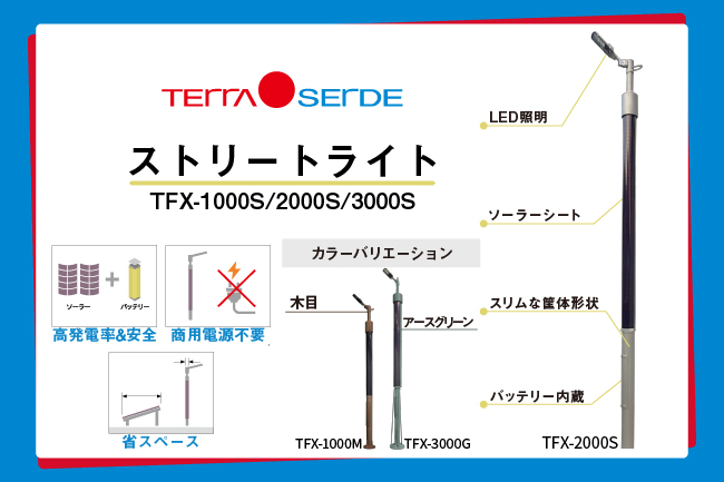 会期中はブース内に「ストリートライト(TFX-1000M/-2000S/-3000G)」実機3本を展示します。カラーは、シルバー・木目・アースグリーンの3色を用意。ソーラーシートやバッテリーの構造、設営風景などもご紹介いたします。