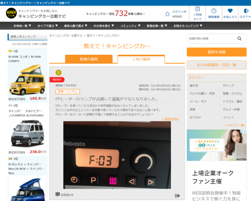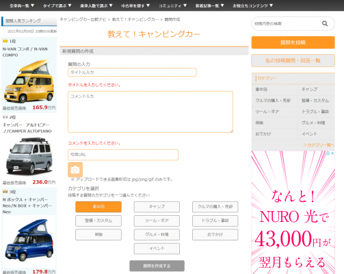 国内で販売されているキャンピングカーのスペックやオーナーなどによるクチコミ評価を比較できる情報サイト「キャンピングカー比較ナビ」を運営するキャンピングカー株式会社(本社:東京都千代田区、代表取締役:頼定 誠)は、同サイト内でキャンピングカーの修理・トラブル、事故など、みんなの力で気になる疑問や悩みを解決するQ&Aコミュニティサービス「教えて!キャンピングカー」を2021年2月10日にリリースしたことをお知らせいたします。