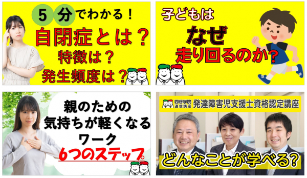 YouTube「四谷学院の発達支援講座ちゃんねる」では、多くの方に発達障害について知っていただくとともに、発達支援に迷っている方や子育てで困ったりしている方のために、役に立つ動画を配信しています。