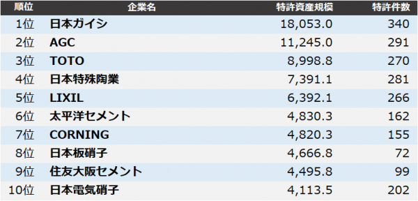 株式会社パテント・リザルトは2月18日、独自に分類した窯業業界の企業を対象に、各社が保有する特許資産を質と量の両面から総合評価した「窯業業界 特許資産規模ランキング2020」をまとめました。2019年4月1日から2020年3月末までの1年間に日本特許庁が登録した特許を対象に、個別特許の注目度を得点化する「パテントスコア」を用いた評価を行い、企業ごとに総合得点を集計しました。