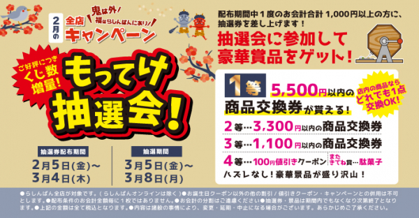 抽選会の参加に必要な抽選券は、2021年2月5日(金)~3月4日(木)の期間中、らしんばん店舗にて一度のお会計金額が1,000円(税込)以上の方に配布中です。