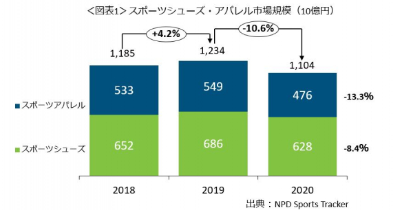 スポーツシューズ・アパレル市場規模は、2020年1.1兆円で10.6%増