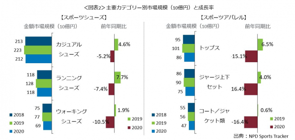 カテゴリー別にみると(図表2)、最大のカテゴリーであるカジュアルシューズの金額市場規模は2020年に2120億円で、5.2%減と、全体の10.6%減と比べ減少幅は小さく、他の主要カテゴリーの中で最も影響が小さかったことが分かります。2番目に市場規模の大きいランニングシューズは、約1180億円で7.4%減でした。
