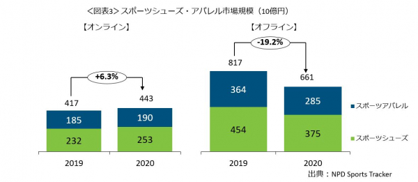 日本におけるスポーツシューズ・アパレル市場規模は、2020年(1月-12月計)に約1.1兆円でした。新型コロナウイルス感染拡大の影響により、前年同期比で10.6%減でした(図表1)。スポーツシューズは約6280億円で8.4%減、スポーツアパレルは、約4760億円で13.3%減でした。