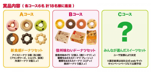 下記『信州牧場のドーナツ1個増量品』の数量限定販売に加え、Twitter上にて下記キャンペーン開催期間内に下記3点の応募条件を全て満たした方の中から抽選で計18名の方に、当社の新食感ドーナツ等の素敵な信州スイーツを進呈致します。